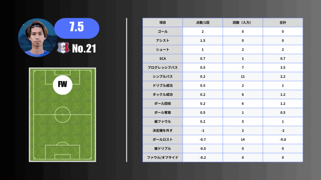 10/4|ポーランド5部 こんすけ🐻❄️⚽/Live Score 2026年3月10日 最終更新日時 : 2026年3月10日 こんすけ【海外サッカー挑戦】 試合結果 Home 2-1(勝ち) 個人スタッツ 出場時間 90分 自己評価 採点 7.5点 前半から積極的にシュートを放ち、チャンスメイクでも存在感を示した 前線からのプレスやボール回収でハードワークを見せ、攻守両面で貢献 一方で決定機を逃す場面もあり、ラストプレーの精度向上が求められる ハイライト \ 最新情報をチェック /